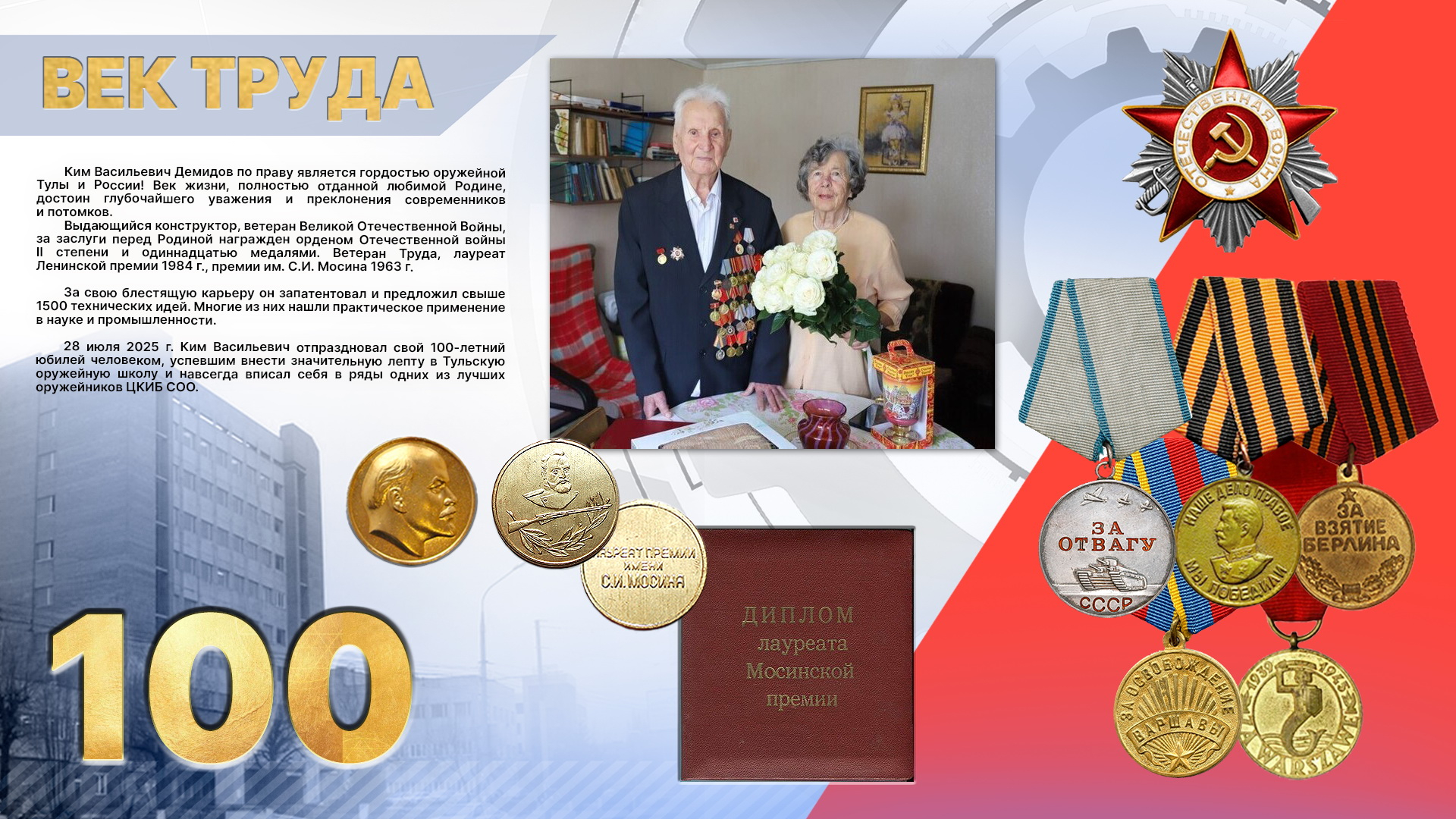 28 июля 2025 г. Ким Васильевич отпраздновал свой 100-летний юбилей человеком, успевшим внести значительную лепту в Тульскую оружейную школу и навсегда вписал себя в ряды одних из лучших оружейников ЦКИБ СОО.