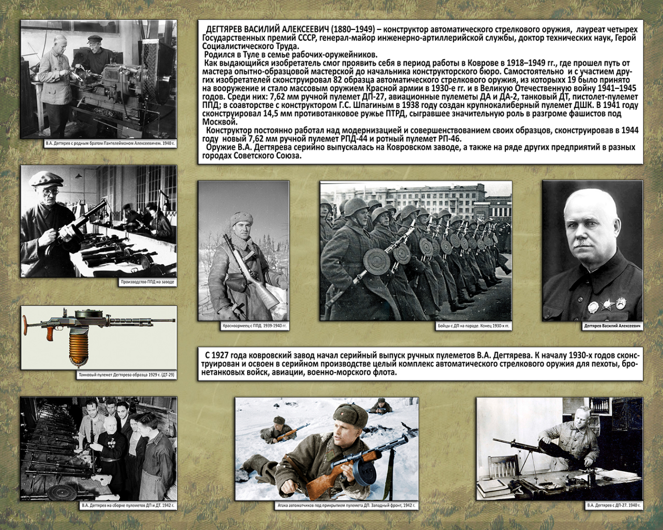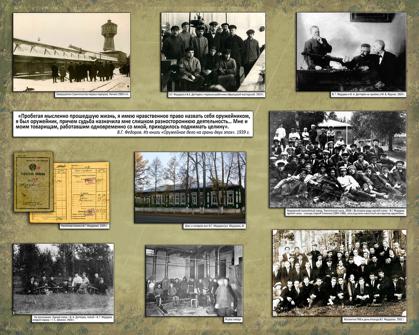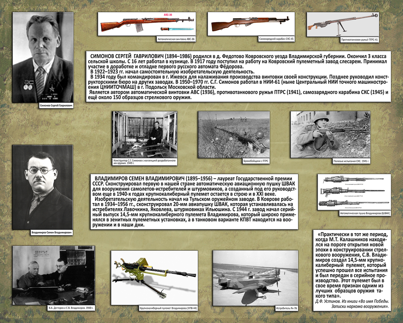 Выставка посвящена истории зарождения и развития Ковровской оружейной школы. На основе подлинных документов раскрывается деятельность инженеров-конструкторов, разработавших в городе Коврове ряд эффективных образцов оружия, которое применялось отечественными войсками в годы Первой и Второй мировых войн.