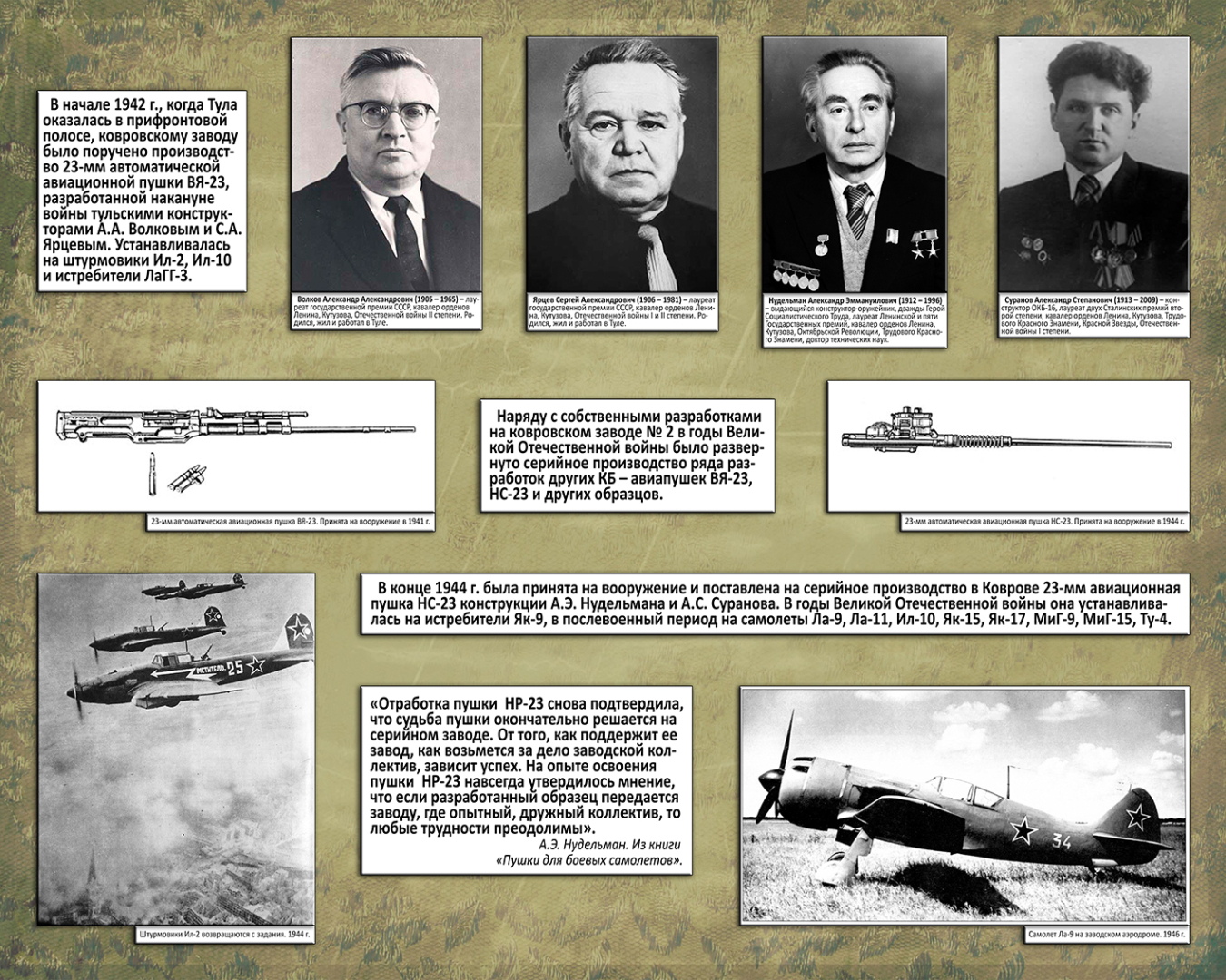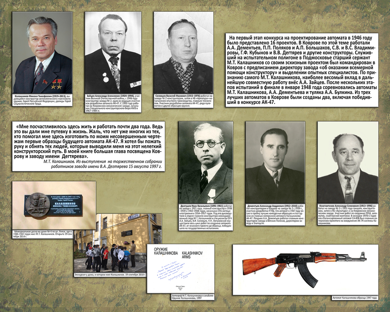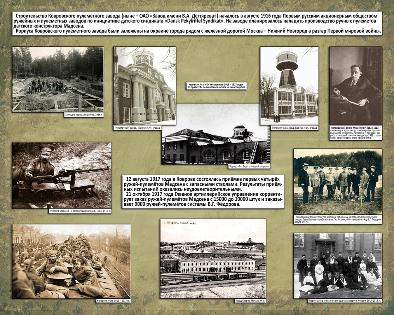 Выставка посвящена истории зарождения и развития Ковровской оружейной школы. На основе подлинных документов раскрывается деятельность инженеров-конструкторов, разработавших в городе Коврове ряд эффективных образцов оружия, которое применялось отечественными войсками в годы Первой и Второй мировых войн.