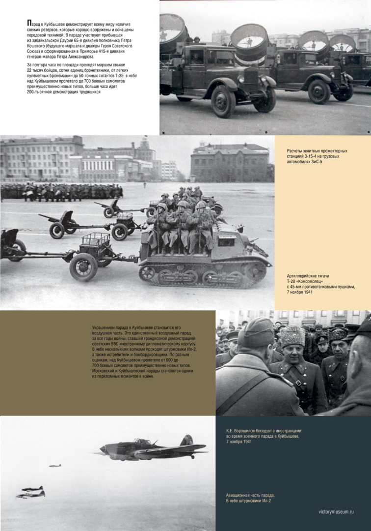 Проект раскрывает историческое значение военных парадов, которые состоялись в Москве, Куйбышеве (Самаре) и Воронеже 7 ноября 1941 года в честь 24-й годовщины Великой Октябрьской социалистической революции. Эти торжественные мероприятия стали свидетельством твердости духа советского народа в тяжелейший период Великой Отечественной войны, когда враг рвался к столице нашей страны. Мужество и стойкость защитников Родины переломили ход событий и обратили в пепел планы завоевателей.