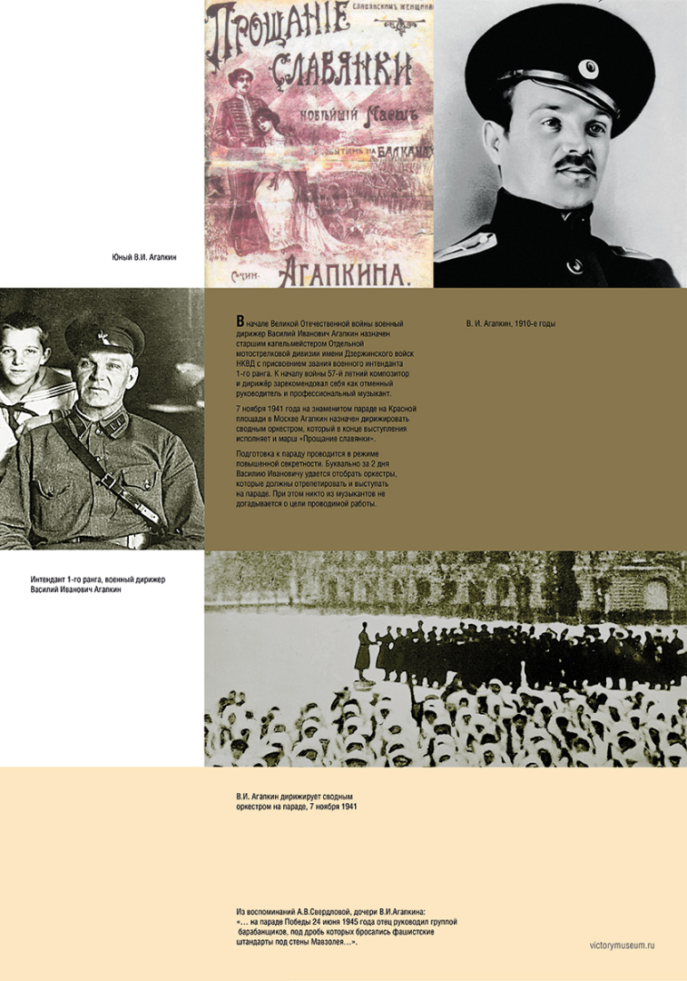 Знаменитый парад на Красной площади в Москве по психологическому воздействию оказался сопоставим с крупной военной операцией. Колонны бойцов уходили на фронт под марш «Прощание славянки», который исполнял сводный оркестр под руководством Василия Ивановича Агапкина – автора этого музыкального произведения.
