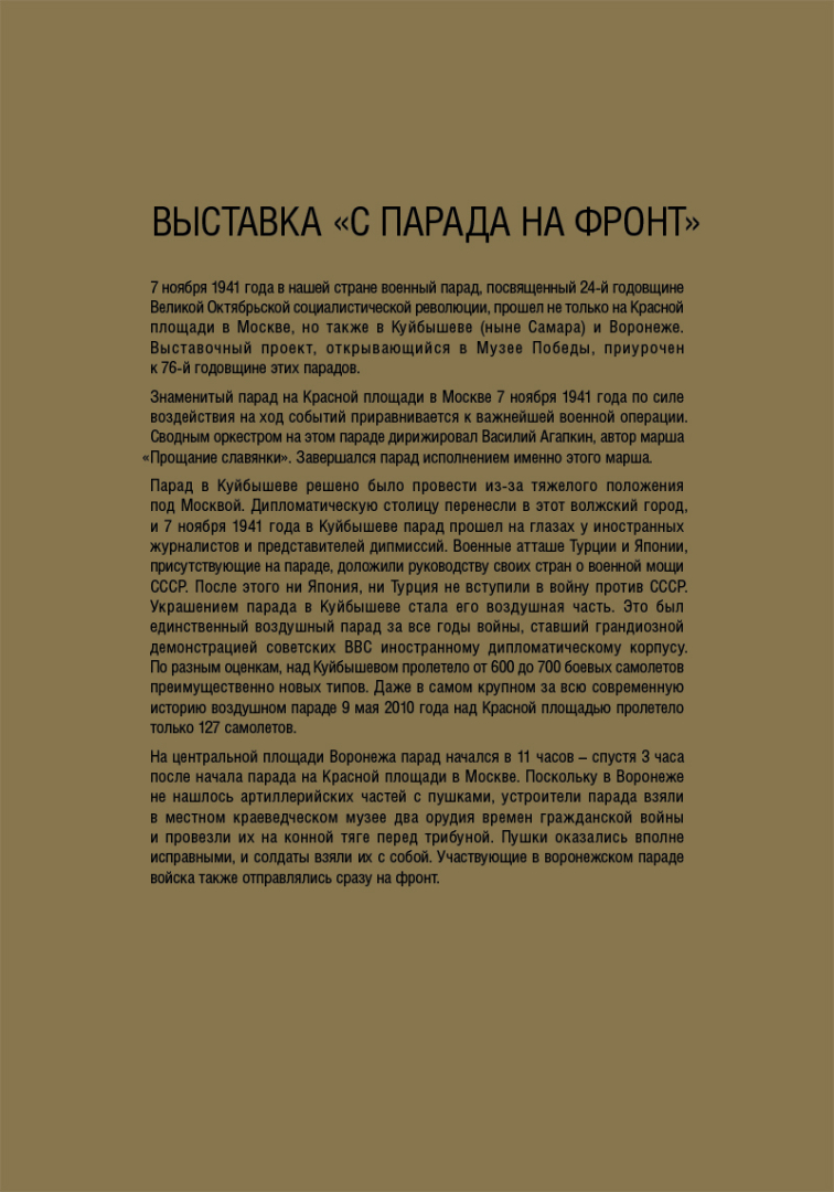 В рамках реализации проекта «Территория Победы» Тульский государственный музей оружия представляет виртуальную выставку «С парада на фронт», созданную Музеем Победы на Поклонной горе (г. Москва).