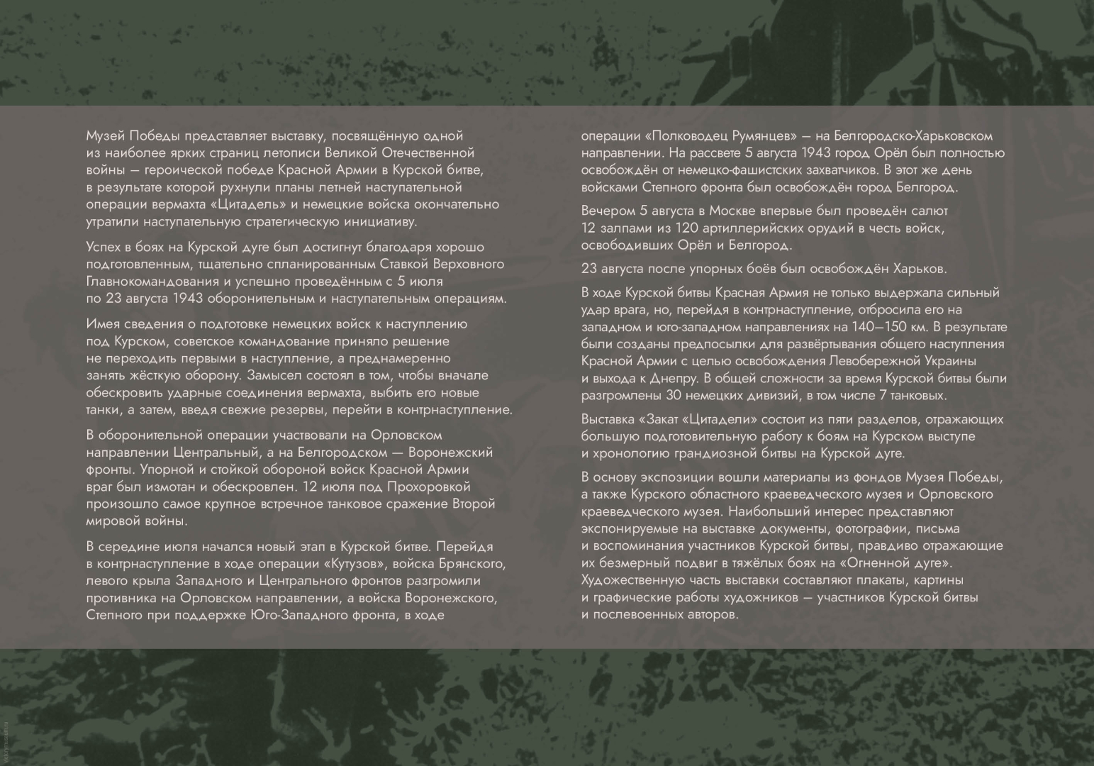 В рамках реализации проекта «Территория Победы» Тульский государственный музей оружия представляет виртуальную выставку «Закат Цитадели», посвященную 80-летию разгрома немецко-фашистских войск в Курской битве.