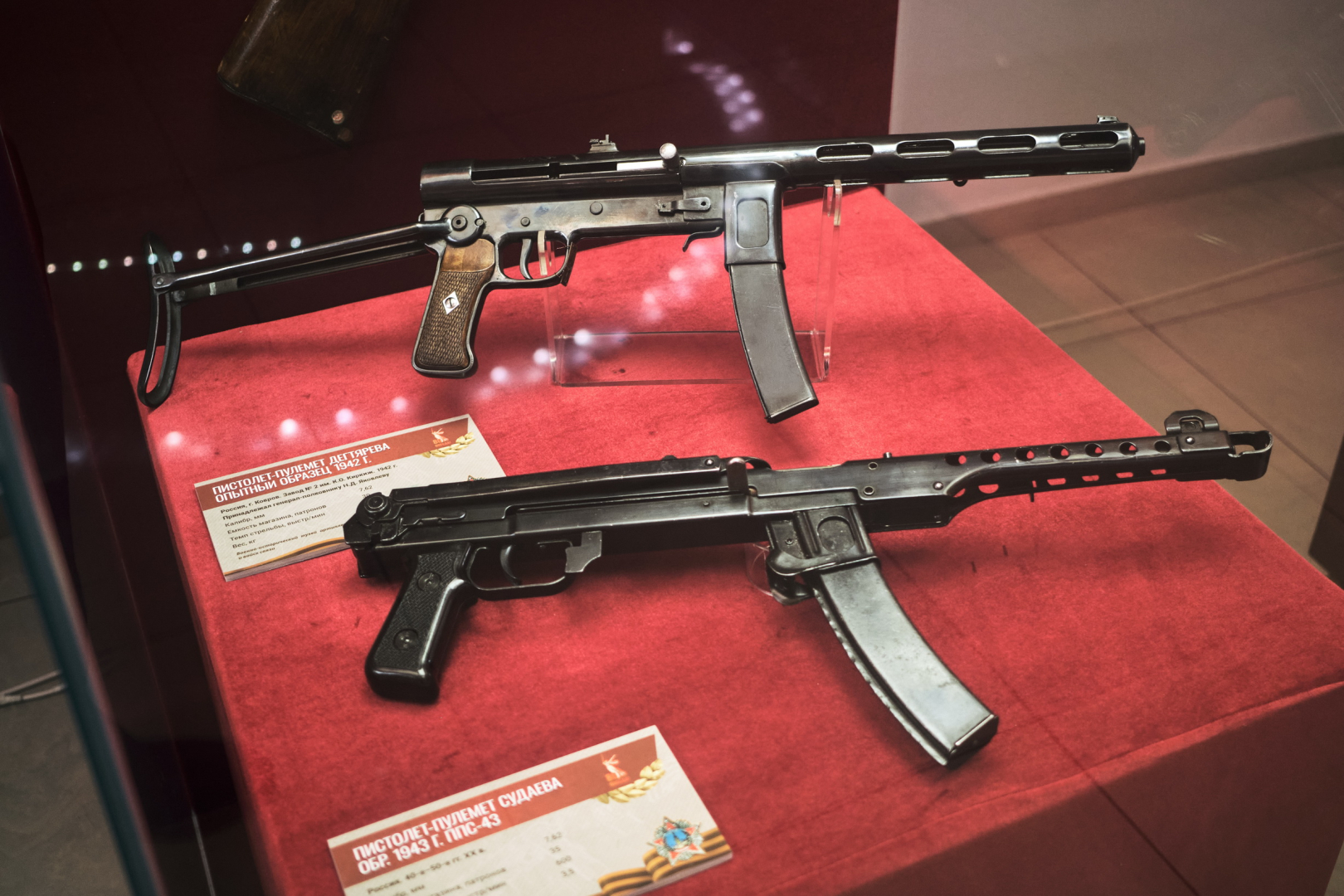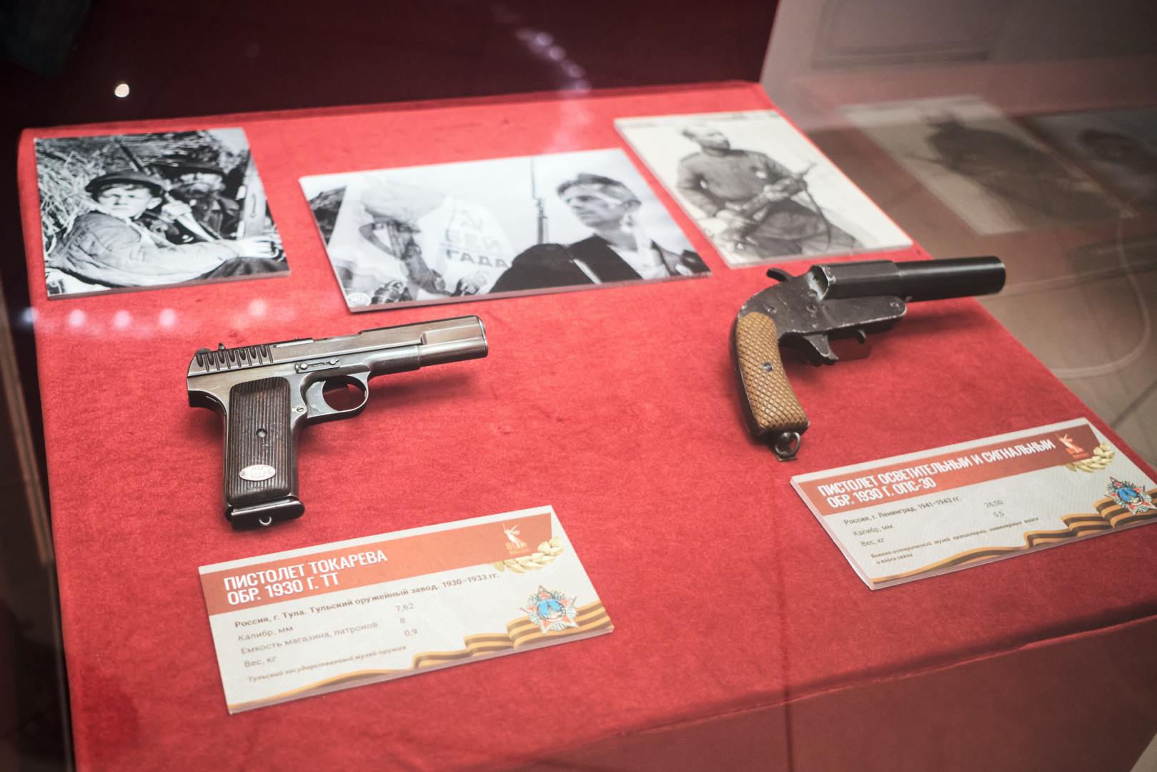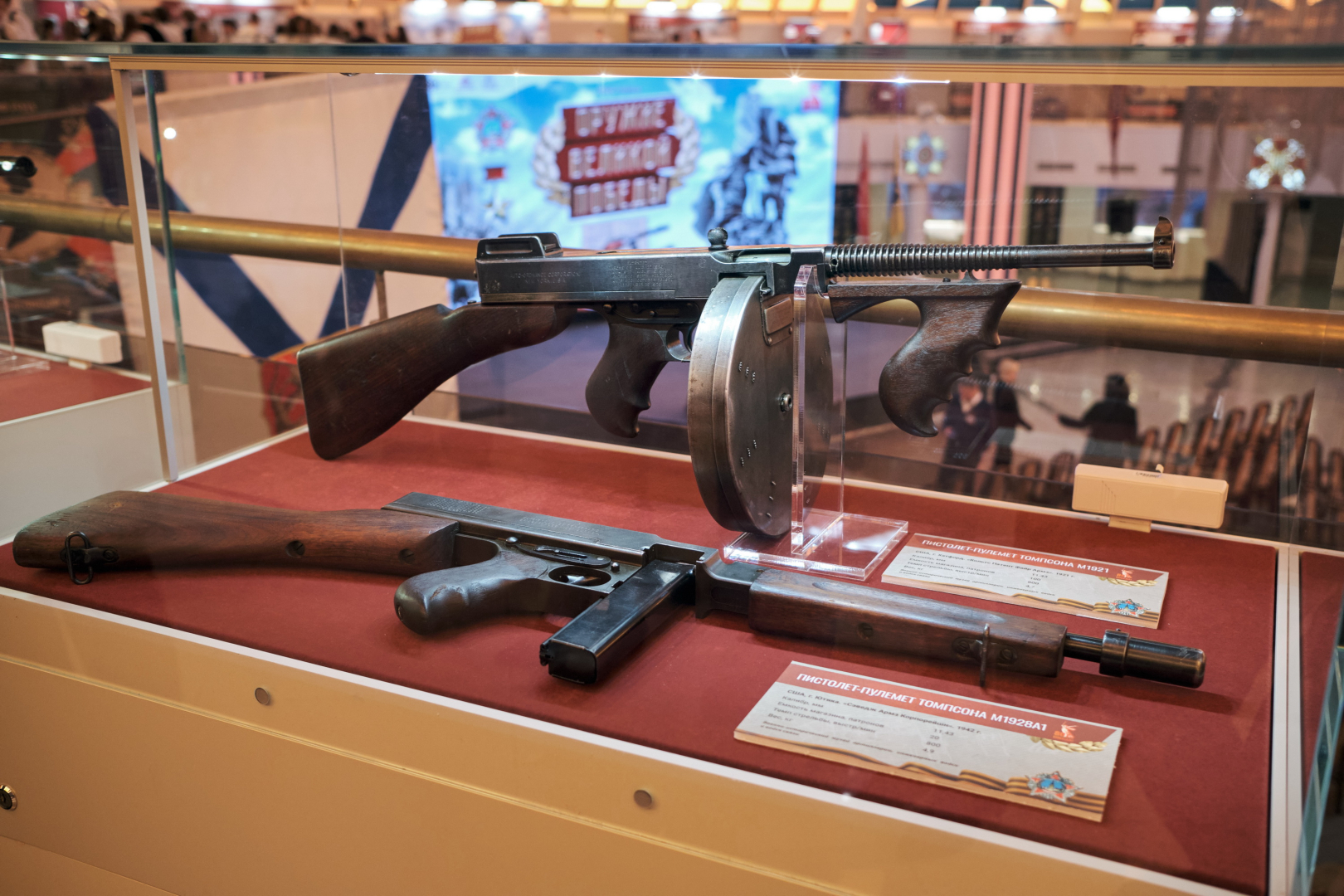 На выставке посетители могут ознакомиться с большей частью Оружия Великой Победы, таким как винтовка Мосина обр. 1891/30 гг., самозарядная винтовка СВТ-40, пистолет ТТ, пистолет-пулемет Дегтярева ППД-40, пистолет-пулемет Шпагина ППШ-41, автоматическая винтовка Симонова АВС-36, авиационный пулемет ШКАС. Важное место в реализации проекта занимают образцы иностранного стрелкового оружия как союзников СССР, так и его противников. Среди экспонатов представлены пистолет-пулемет Томпсона М1921, пистолет-пулемет СТЭН Mk II, самозарядная винтовка М1 Гаранд, единый пулемет MG-42, штурмовая винтовка StG-44 и многие другие.