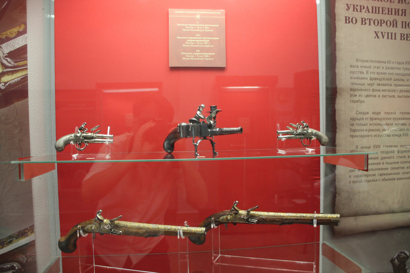 Вниманию посетителей представлено свыше 50 уникальных предметов работы тульских мастеров XVIII – XXI веков: дуэльные пистолеты, авторское холодное оружие, охотничьи и спортивные ружья, украшенные в разнообразных техниках обработки металла, дерева, кости и камня, а также действующие миниатюры оружия.