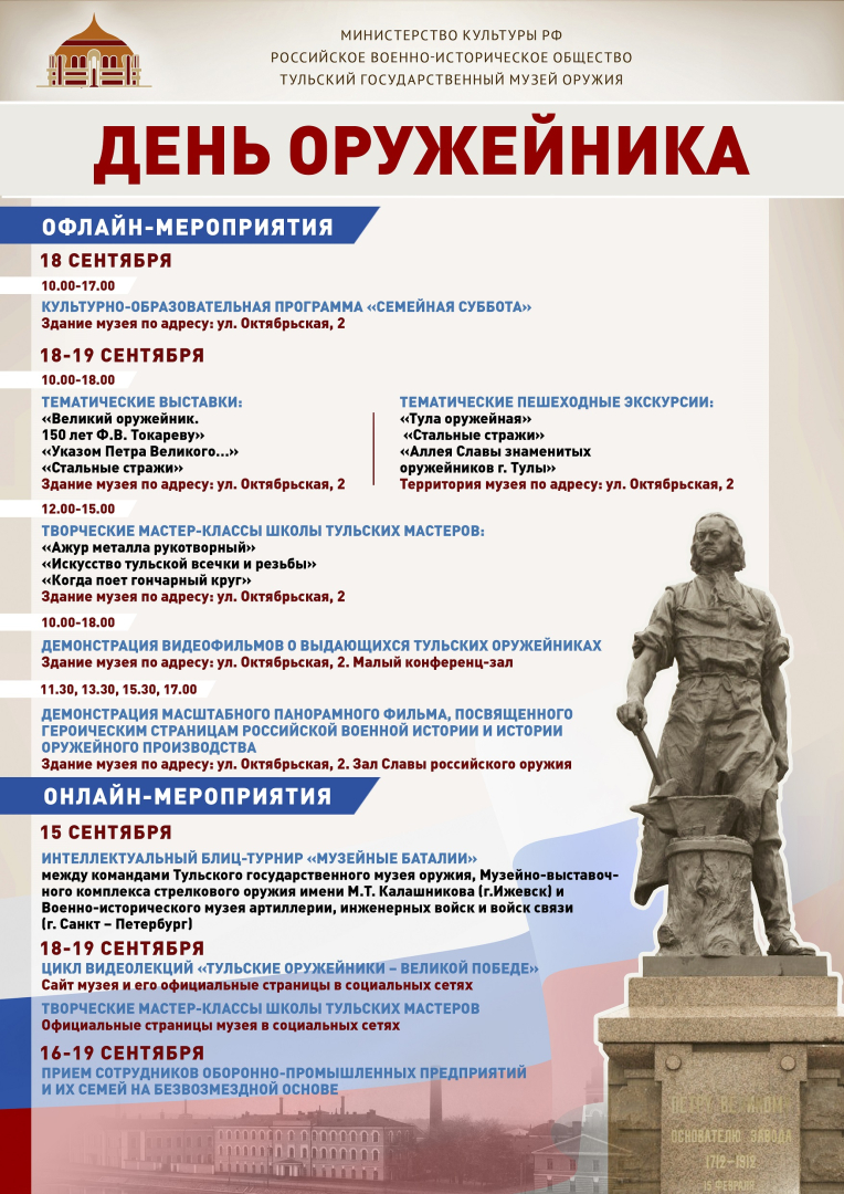 18 и 19 сентября в музейных соцсетях и на сайте мы опубликуем специально подготовленную захватывающую серию видео «Тульские оружейники – Великой Победе». Музей не забудет и про любителей мастер-классов: новые творческие презентации от лучших оружейников города Тулы появятся в видео-формате на наших страничках в VK, Одноклассниках и Twitter, а также на YouTube-канале. Подписывайтесь и не пропустите!