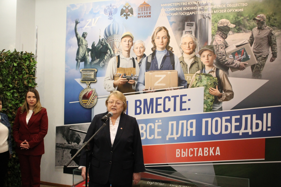 Гостей сердечно приветствовала директор музея оружия, заслуженный работник культуры Российской Федерации, Почетный гражданин Тульской области Н.И. Калугина. Надежда Ивановна отметила «необходимость открытия выставки, которая демонстрирует актуальную тему - всенародную поддержку участников специальной военной операции». Глубокая благодарность была высказана партнерам музея – волонтерским движениям и всем, кто вносит личный вклад в поддержку наших воинов.