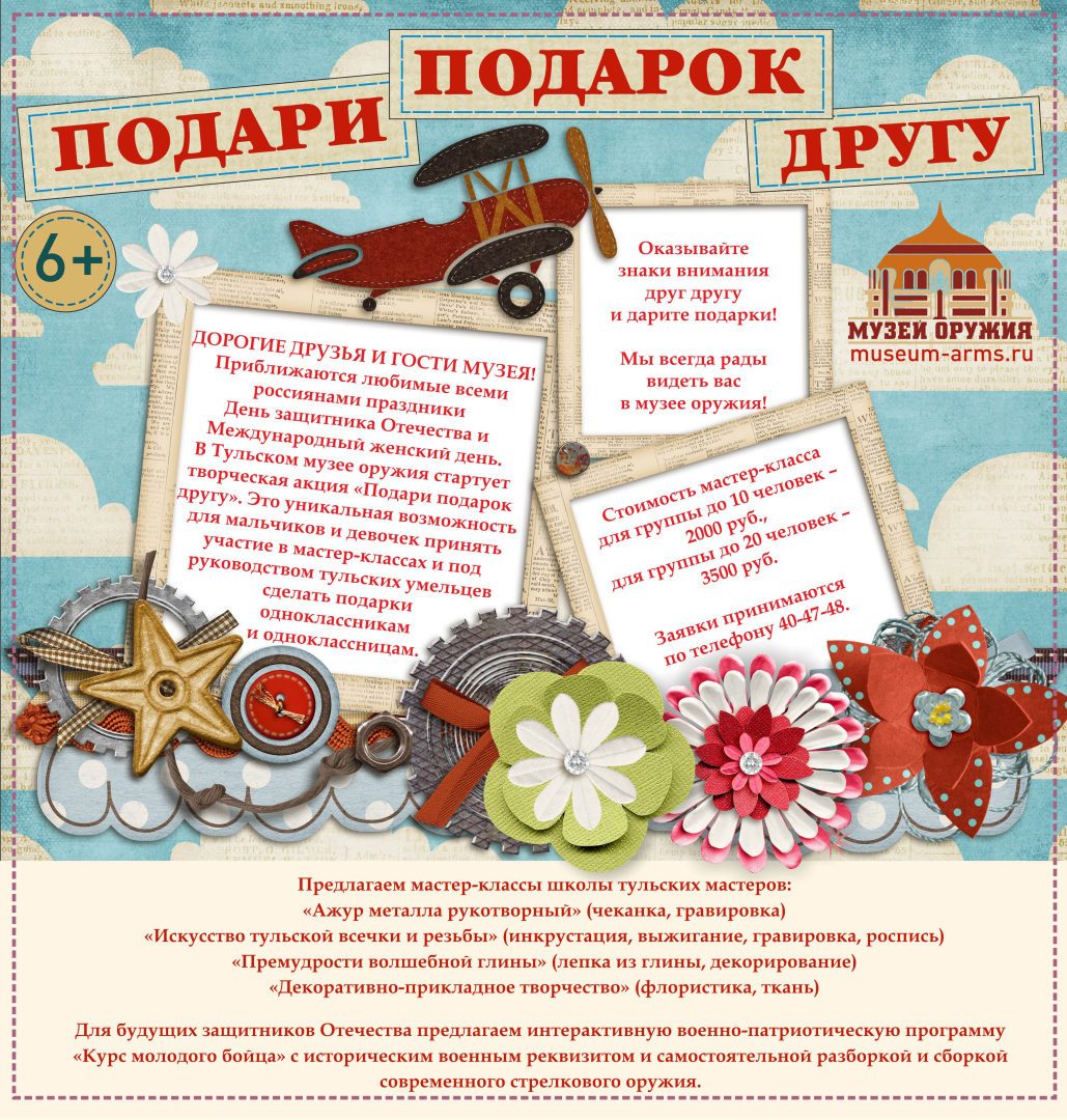 В Тульском музее оружия стартует творческая акция «Подари подарок другу». Это уникальная возможность для мальчиков и девочек принять участие в мастер-классах и под руководством тульских умельцев сделать подарки одноклассникам и одноклассницам.