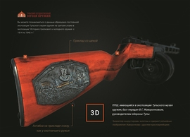 Главная особенность – это первые сервисы про оружие, в создании которых участвовали музейные специалисты. Поэтому интернет-проект гарантирует историческую и техническую точность 3D моделей, изготовленных по настоящим чертежам и схемам, редким фотографиям, а также содержит интересную и в то же время достоверную информацию об истории вооружения до победного 1945-го. Например, пистолет-пулемёт Шпагина ─ один из главных символов победы в Великой Отечественной войне. Это оружие было очень надёжным и крайне эффективным. Темп стрельбы пистолета-пулемёта достигал 1000 выстрелов в минуту, поэтому плотный огонь наступающих бойцов не давал захватчикам подняться из окопов. Мало известна система ««Огненный еж» - 88 единиц ППШ (11 рядов по 8 пистолетов-пулеметов), которую планировали размещать на штурмовых самолетах для поражения пехотных подразделений противника. Благодаря своим особенностям ППШ стал самым массовым автоматическим оружием пехоты ─ тыл дал фронту более 6 миллионов «стволов».