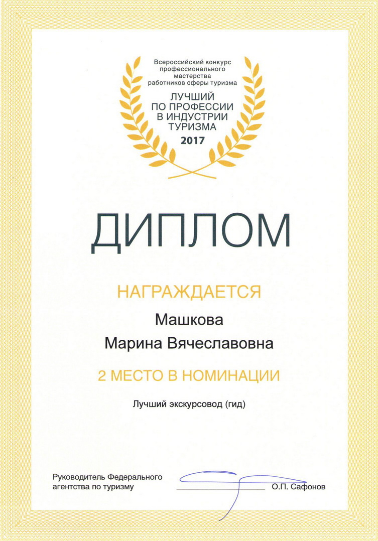 В Москве состоялась церемония награждения победителей и призеров юбилейного пятого Всероссийского конкурса профессионального мастерства «Лучший по профессии в индустрии туризма - 2017». Дипломы и памятные призы лучшим представителям отрасли вручил заместитель Руководителя Федерального агентства по туризму Николай Королёв. Всего в 2017 году конкурс проводился в 51 субъекте Российской Федерации, свои заявки подали более 350 человек. Впервые среди призеров конкурса представитель Тульской области – заведующий экскурсионным отделом Тульского государственного музея оружия М.В. Машкова заняла второе место в номинации «Лучший экскурсовод (гид)». Поздравляем Марину Вячеславовну!!!