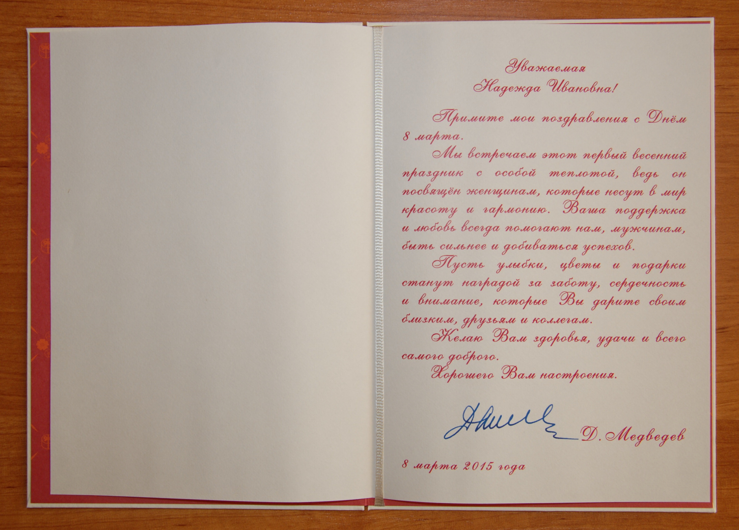 Председатель Правительства Российской Федерации Дмитрий Анатольевич Медведев поздравил директора Тульского государственного музея оружия Надежду Ивановну Калугину с Днем 8 марта.