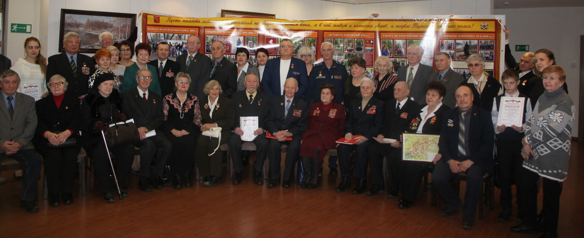 Ветеранов Великой Отечественной войны Кульпова Николая Ивановича, Мирошниченко Василия Марковича, Глухову Лидию Михайловну, Райчук Пелагею Ивановну и участников мероприятия приветствовали глава города-героя Тулы Слюсарева Ольга Анатольевна, советник-наставник Правительства Тульской области Фомина Галина Григорьевна и председатель Тульского областного комитета Российского союза ветеранов Выродов Виктор Георгиевич.
