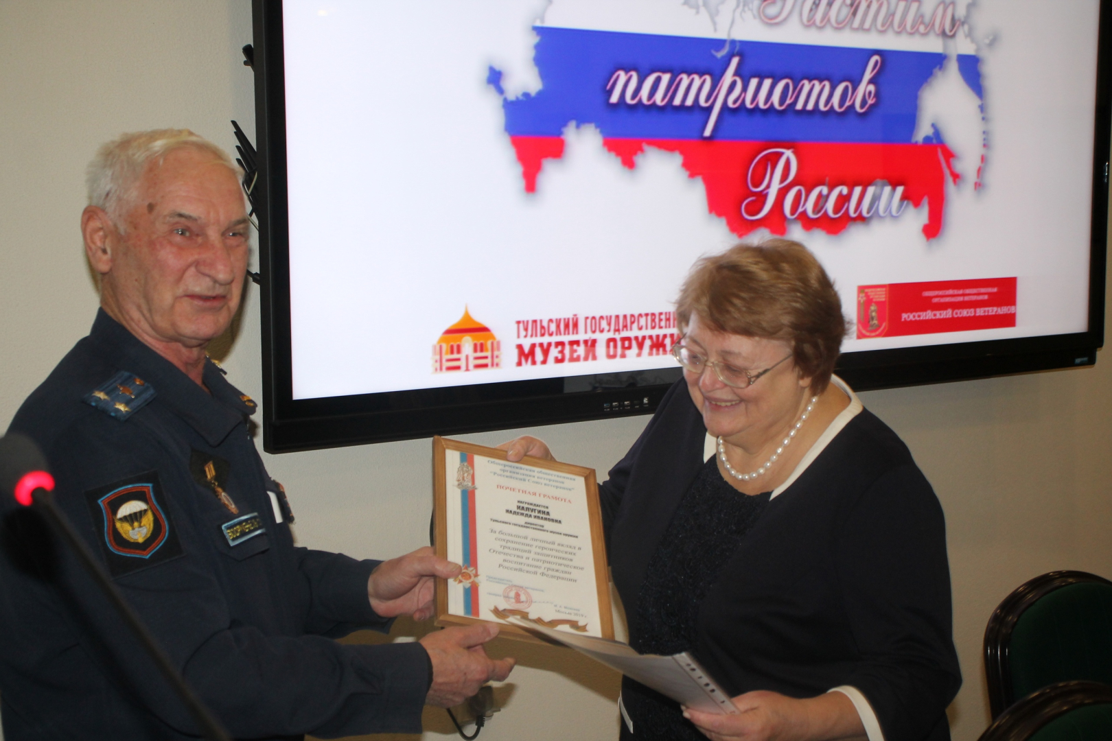 За большой личный вклад в сохранение героических традиций защитников Отечества и патриотическое воспитание граждан Российской Федерации почетной грамотой и дипломом Российского союза ветеранов награждена директор Тульского государственного музея оружия Калугина Надежда Ивановна.