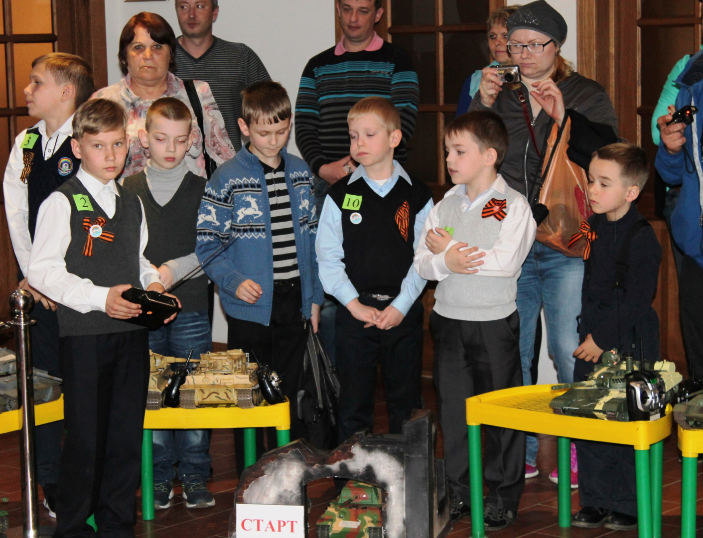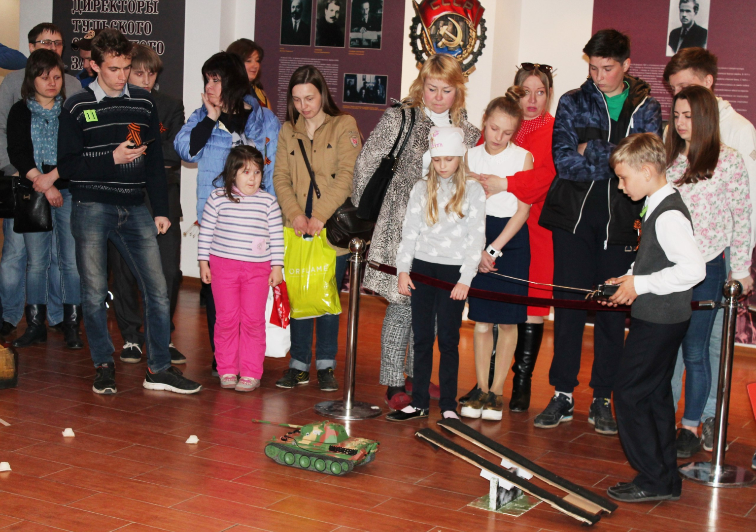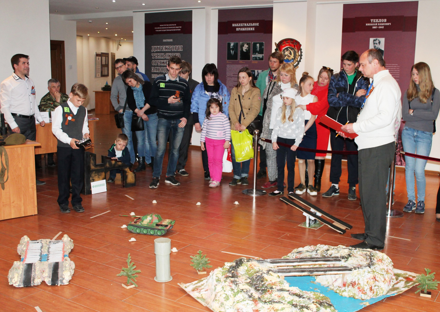 По традиции праздничная программа в музее оружия открылась трансляцией Парада Победы с Красной Площади и патриотической акцией «Георгиевская ленточка». На импровизированном танкодроме музея оружия в эти минуты проходит увлекательная тактическая игра-соревнование «Танковые бои» на радиоуправляемых моделях танков «Т-34» и «Тигр».