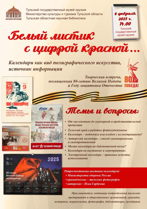 Календари как вид полиграфического искусства, источник информации: презентация выставочного проекта, посвященного 80-летию Великой Победы и Году защитника Отечества в Тульском музее оружия.