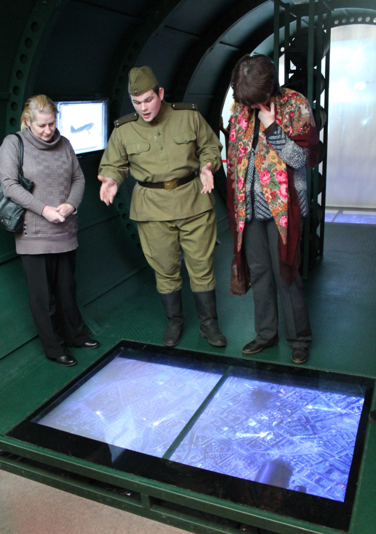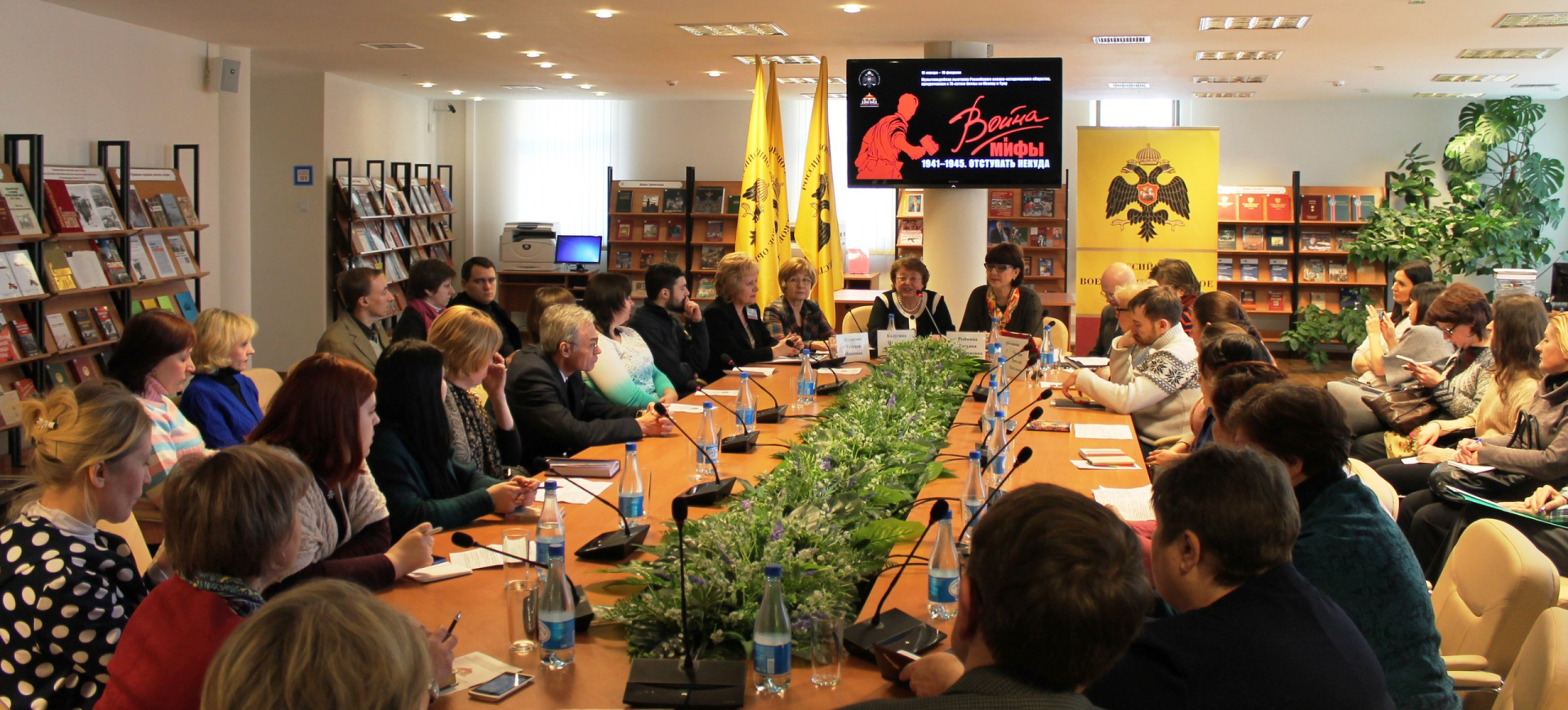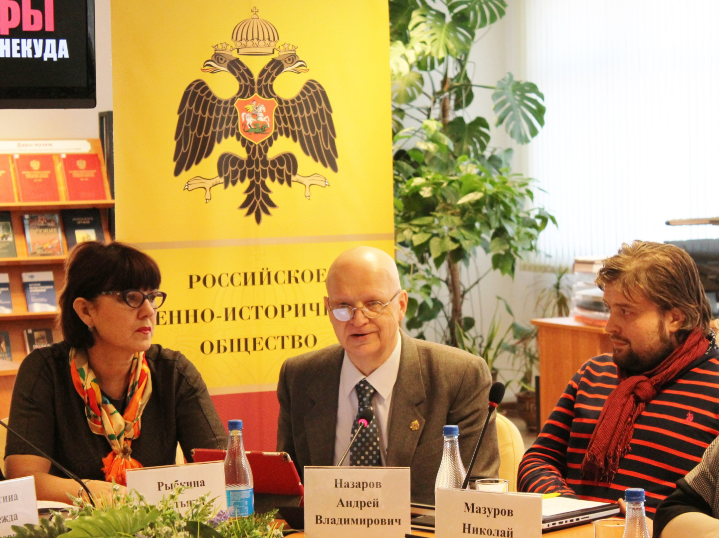 Советник Председателя Российского военно-исторического общества А.В. Назаров и один из авторов концепции выставки «Война и мифы» Н.Н. Мазуров поделились с коллегами опытом создания актуальных выставочных проектов с применением современных мультимедийных технологий и средств.