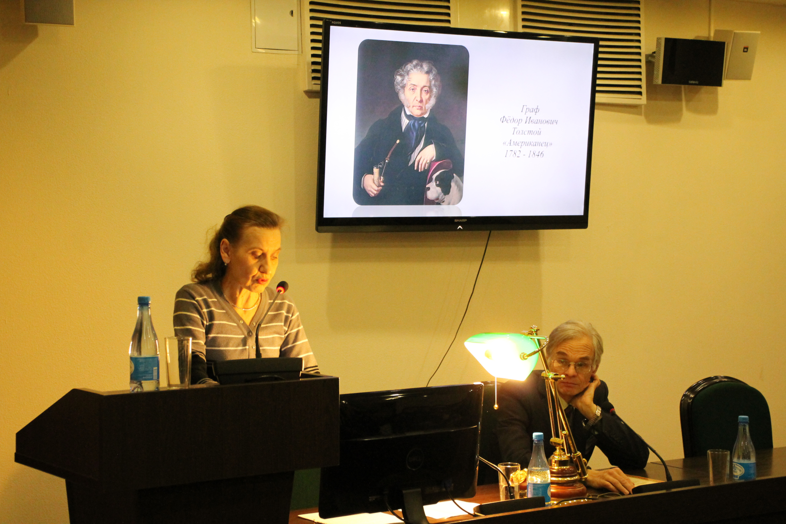 Евгения Петровна Гриценко, старший научный сотрудник научно-исследовательского отдела музея-усадьбы Л.Н. Толстого «Ясная Поляна», подробно раскрыла тему ратной славы рода Толстых до сегодняшних дней. Особое внимание было уделено участию Льва Николаевича Толстого в Кавказской и Крымской войнах.