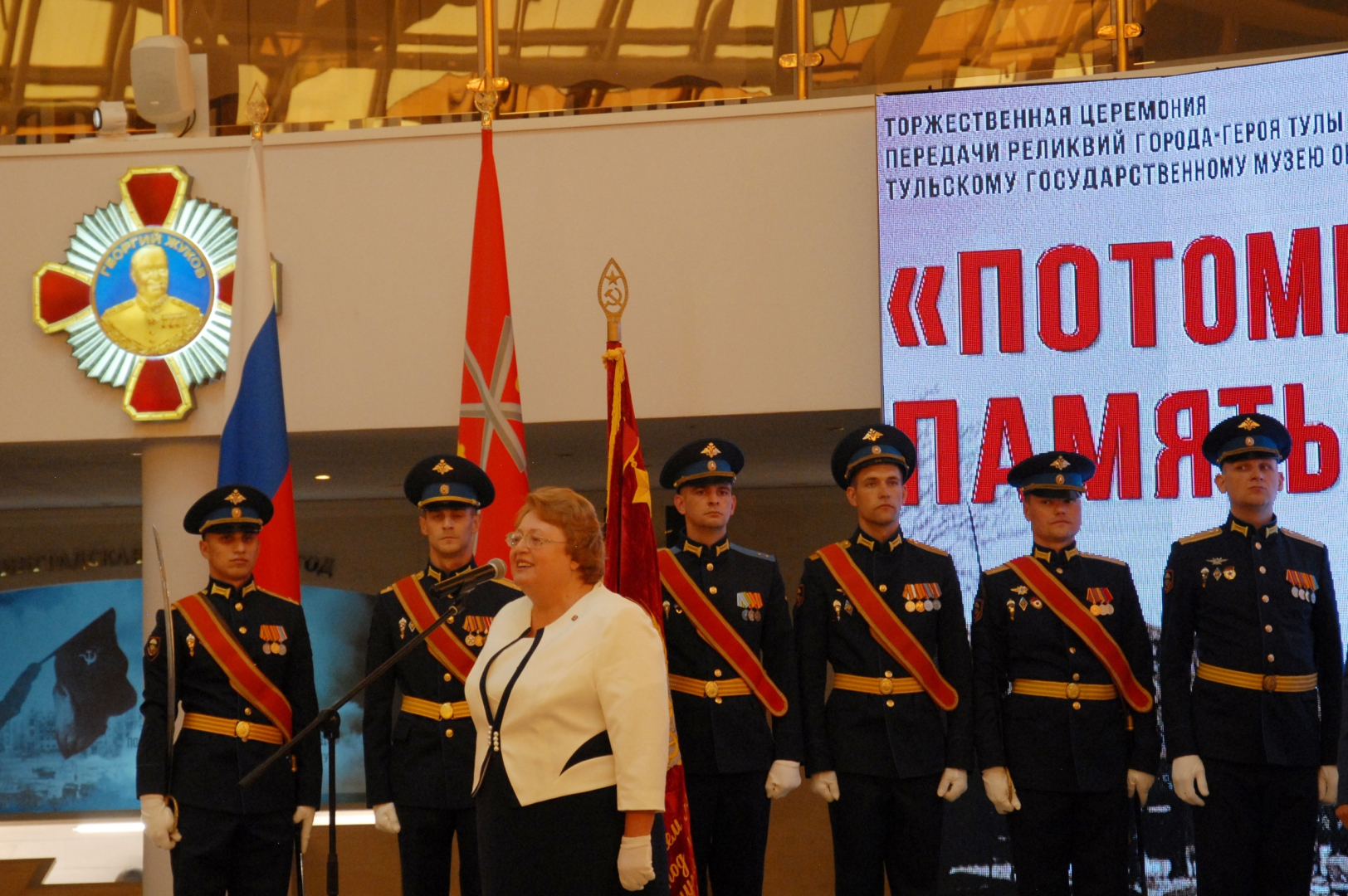 В своем выступлении директор Тульского государственного музея оружия, Почетный гражданин Тульской области передала глубокую сердечную благодарность Министра культуры Российской Федерации В.Р. Мединского руководству города Тулы и ветеранам Великой Отечественной войны за решение доверить музею оружия реликвии, связанные с присвоением Туле высшего звания «Город-Герой». Директор отметила великую честь и особую ответственность для музея, важность этого события в его 145-летней истории. Реликвии и соответствующие документы являются символами героического подвига Тулы в годы Великой Отечественной войны. Музей обеспечит сохранность этих ценных предметов, а также широкое экспонирование и представление их всем тулякам и гостям города.