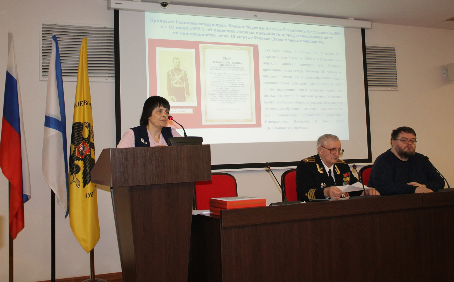 Экскурс в историю подводного флота начался с рассказа капитана 1 ранга, Почетного гражданина Тульской области Б.В. Соколова о первой боевой подводной лодке «Дельфин», одним из создателей и первым капитаном которой был наш земляк капитан 2-го ранга М.Н. Беклемишев.