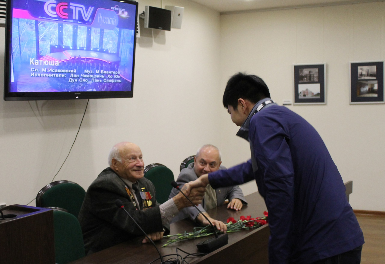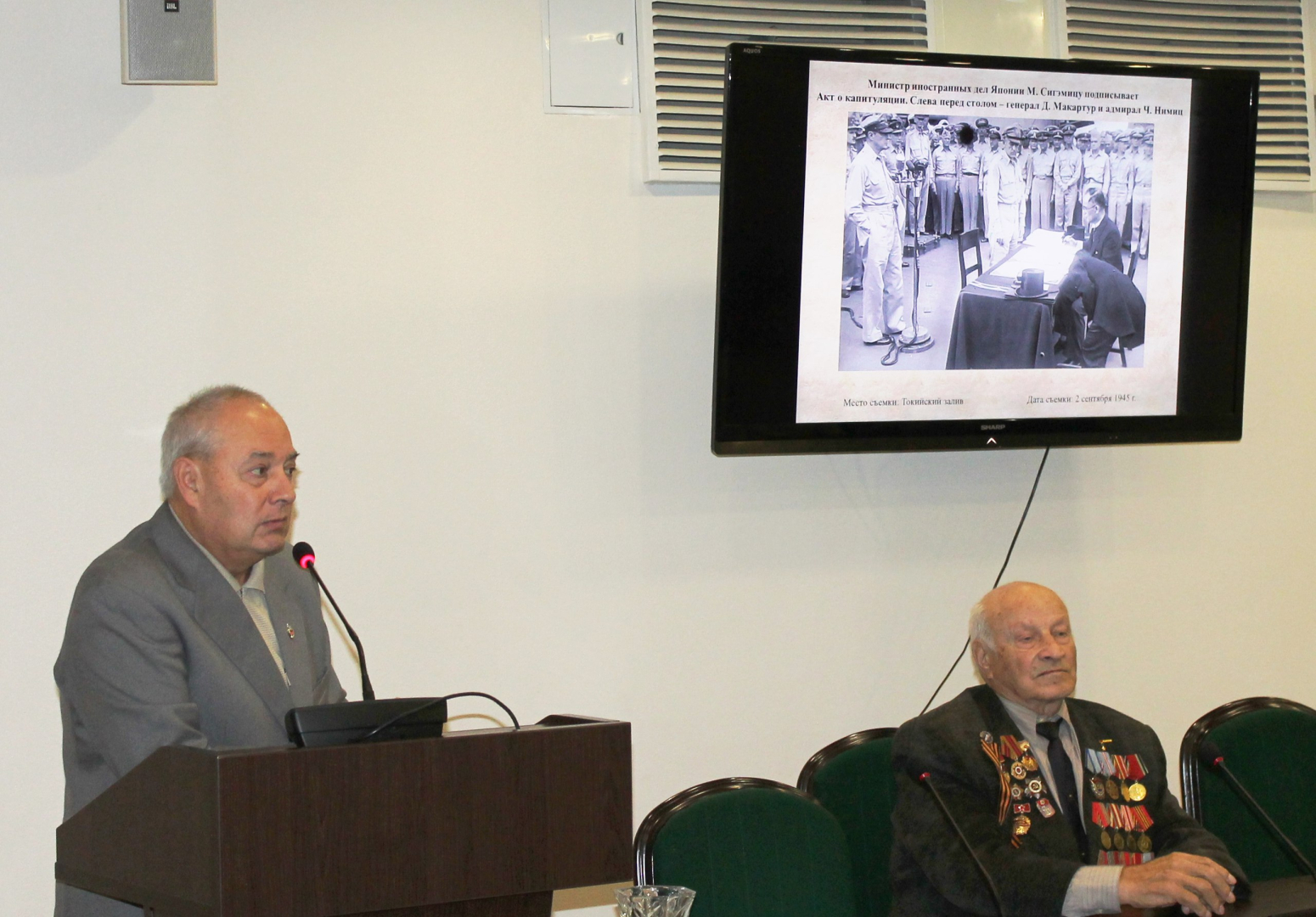 Участник боев на Дальнем Востоке, артиллерист-наводчик №1 отдельного истребительного противотанкового дивизиона В.В. Старцев поделился с ребятами воспоминаниями о событиях 1945 года у горного хребта Хинган и в Манчжурии. Историк, заместитель председателя Тульского регионального отделения общественной организации ветеранов ОВД и внутренних войск России Б.С. Земсков познакомил студентов с интересными историческими фактами о 4 парадах Победы 1945 года.