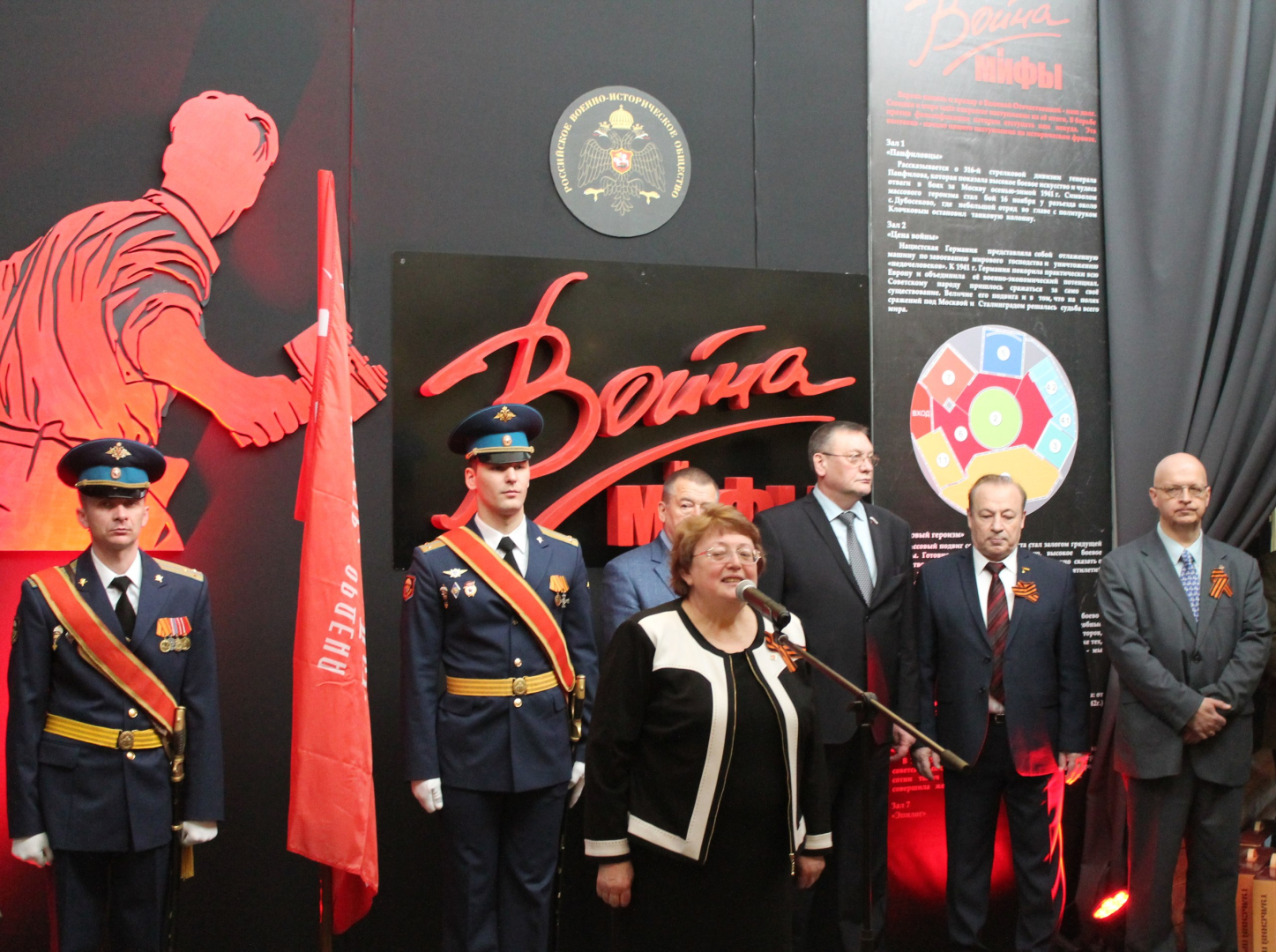 Директор музея оружия Н.И. Калугина в своем выступлении поблагодарила Министра культуры РФ, председателя Российского военно-исторического общества В.Р. Мединского за решение экспонировать уникальную выставку «Война и мифы» в городе-герое Туле после успешного старта в Москве.
