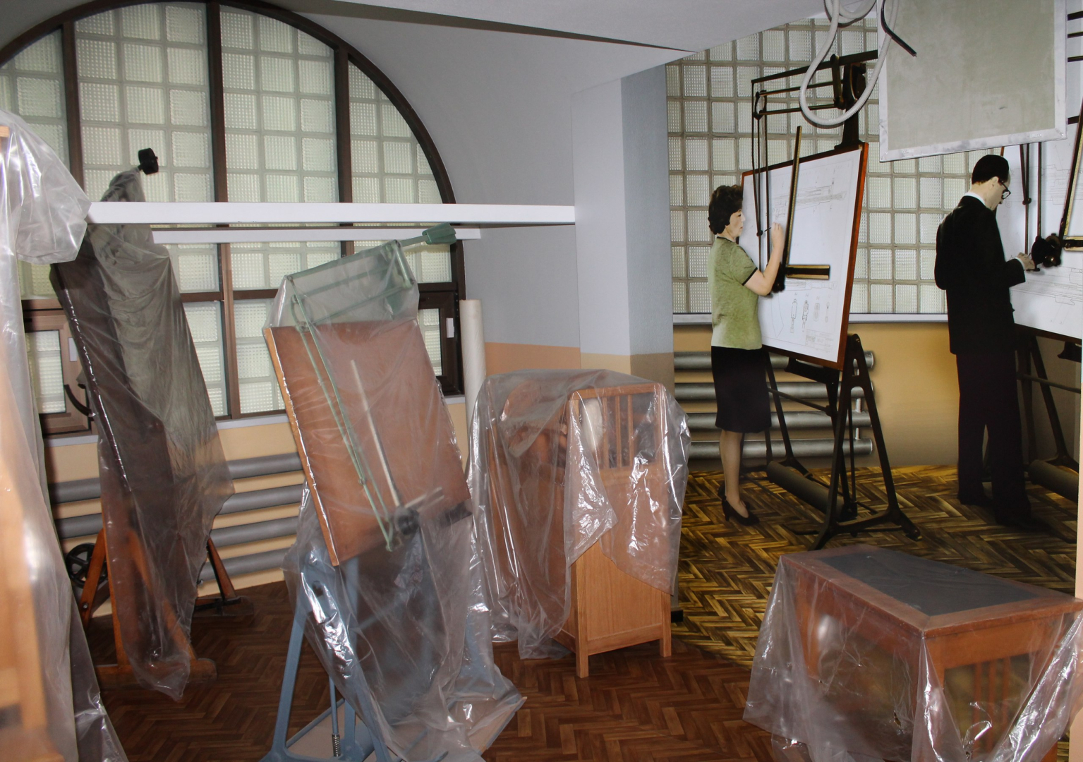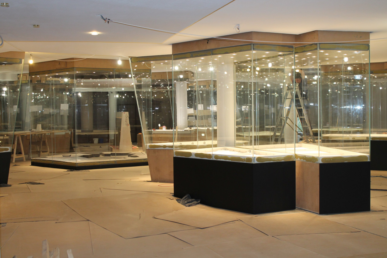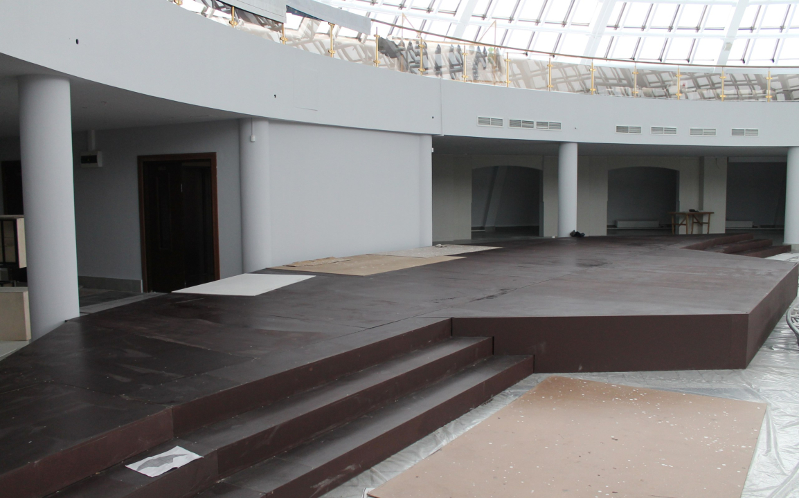 Работы по созданию экспозиционных комплексов на 4-м и 5-м этажах здания-шлема идут полным ходом. Декорированы объемно-пространственные композиции «Фотоохота» и «Конструкторское бюро», установлены основания витрин, в том числе – по периметру зала 5-го этажа, который будет посвящен двенадцати наиболее значимым победам российского оружия: от Куликовской битвы до взятия Берлина в 1945-м.