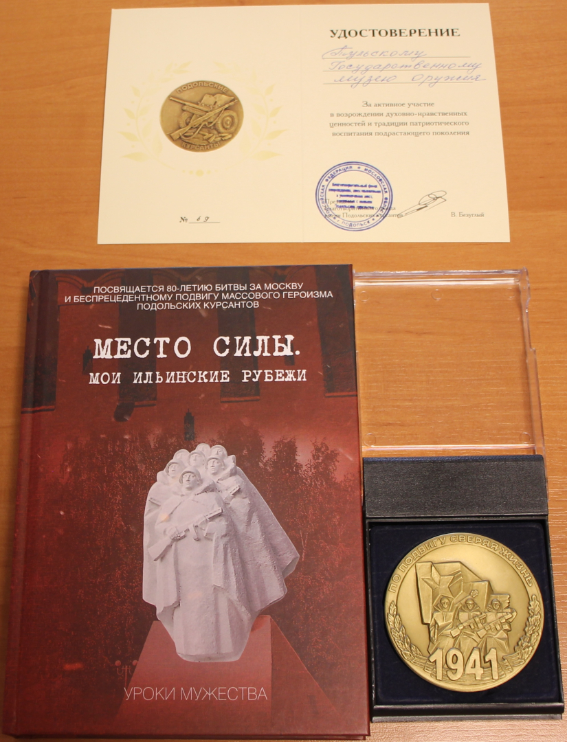 Тульский музей оружия уже много лет традиционно принимает участие в реализации Всероссийского масштабного проекта «Эстафета поколений». Сегодня за активное участие в возрождении духовно-нравственных ценностей и традиции патриотического воспитания подрастающего поколения коллектив Тульского музея оружия был награжден Памятной медалью Благотворительного фонда имени Подольских курсантов.