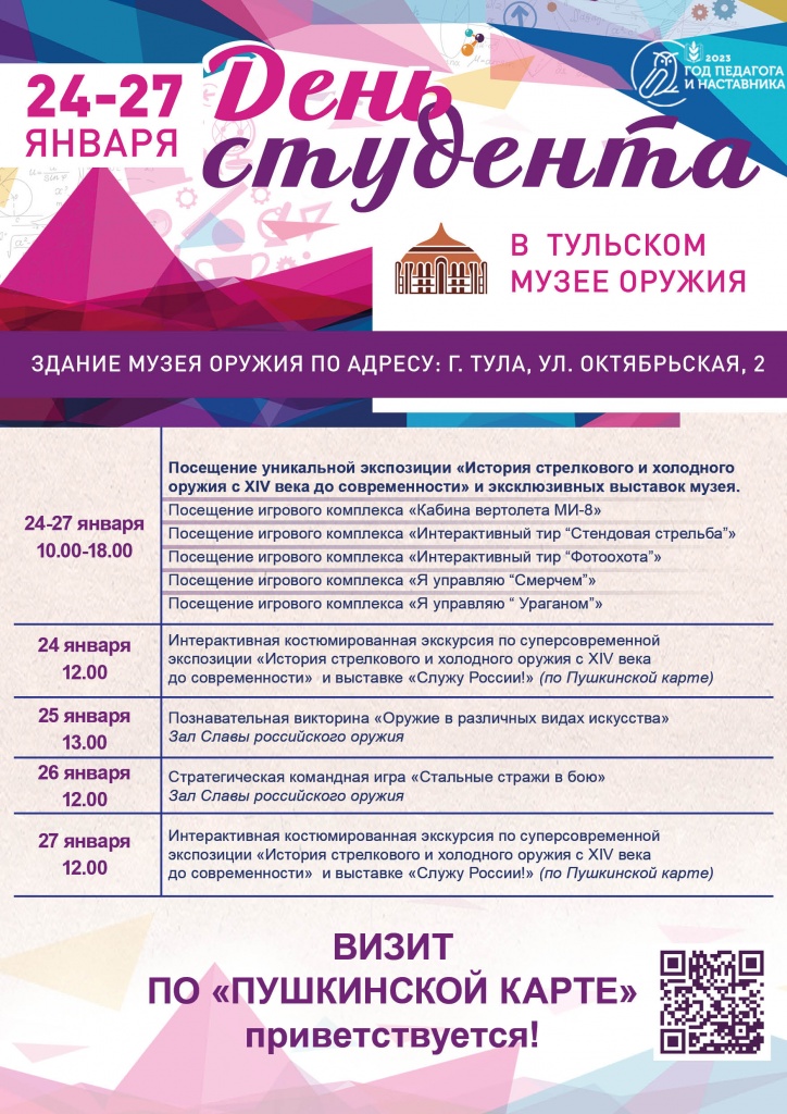 Кроме того, студенты российских учреждений профессионального образования, посещающие в эти дни музей оружия и купившие входной билет на экспозицию «История стрелкового и холодного оружия с XIV века до современности» по «Пушкинской карте» могут познакомиться с историей оружейного производства Тулы и России на бесплатной экскурсии в составе сборной группы или бесплатно воспользоваться аудиогидом (при предъявлении студенческого билета).